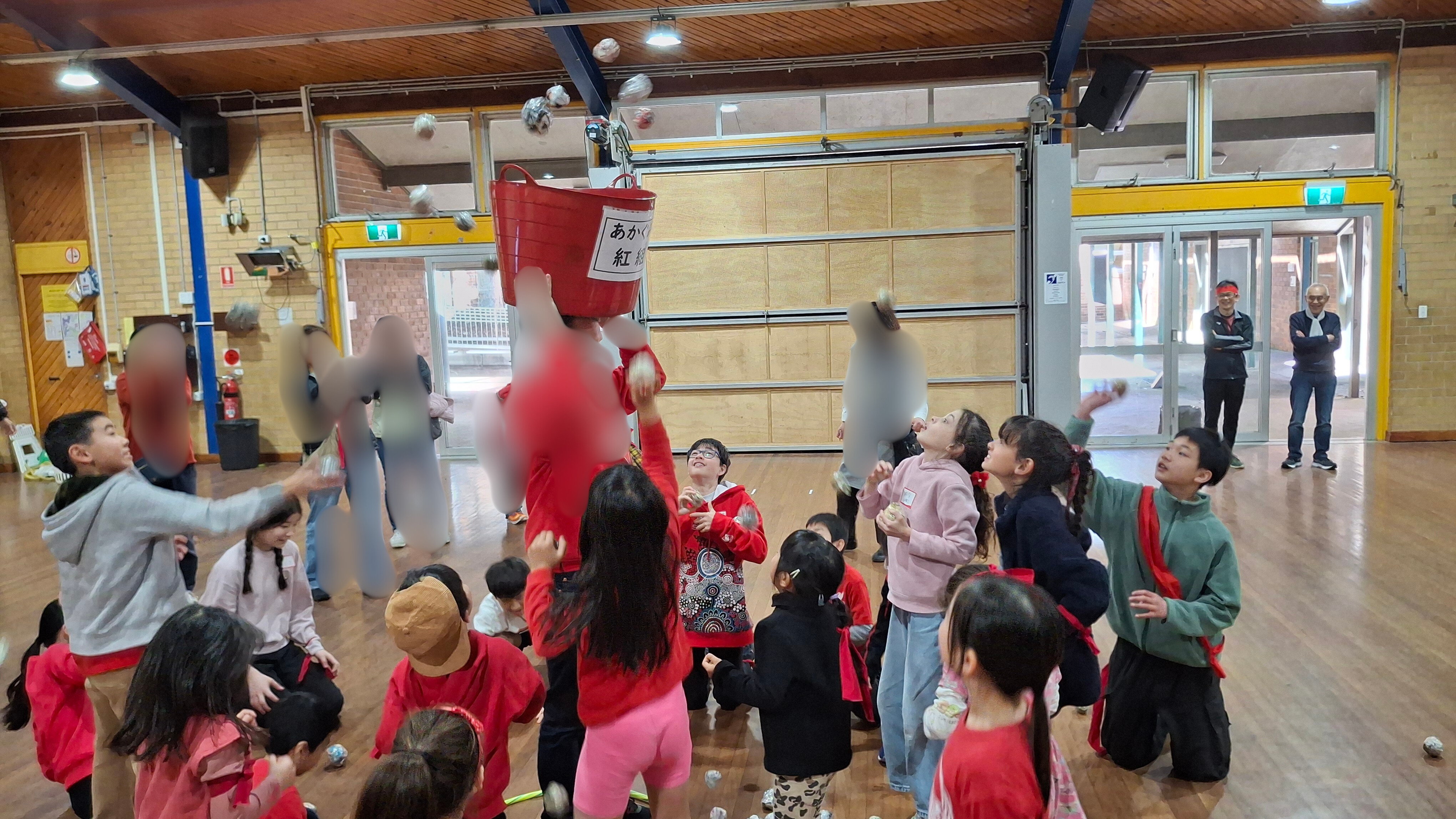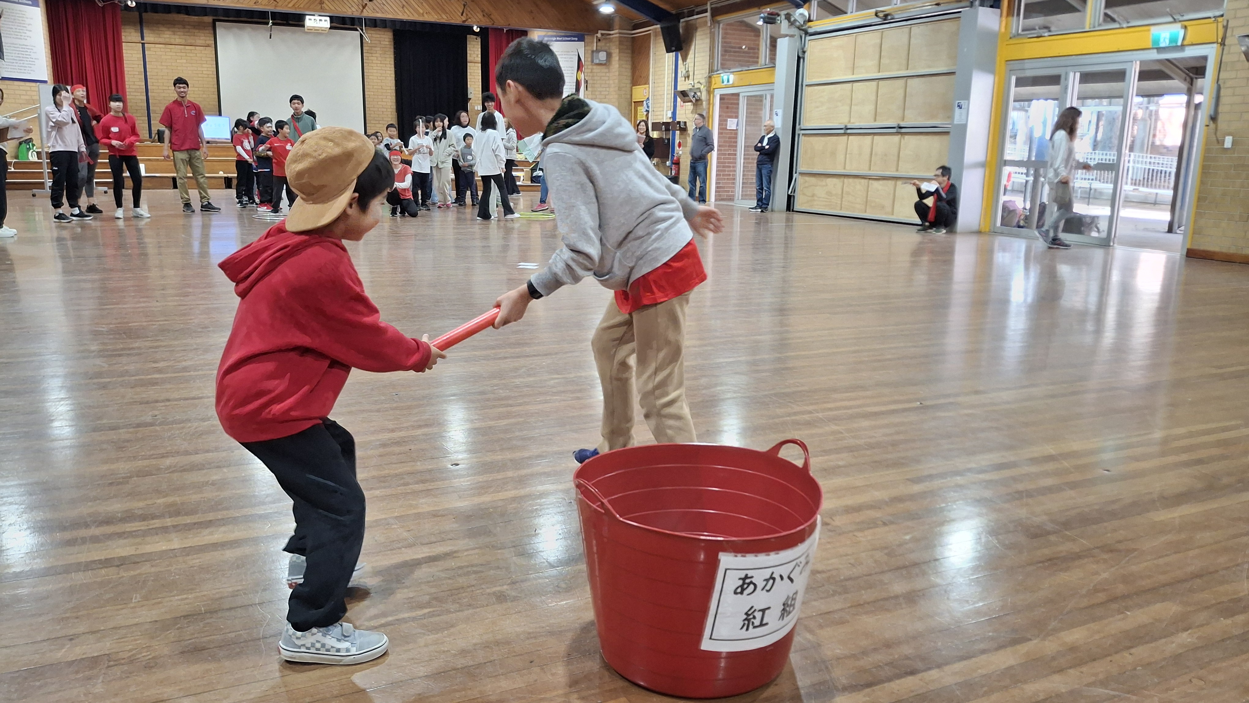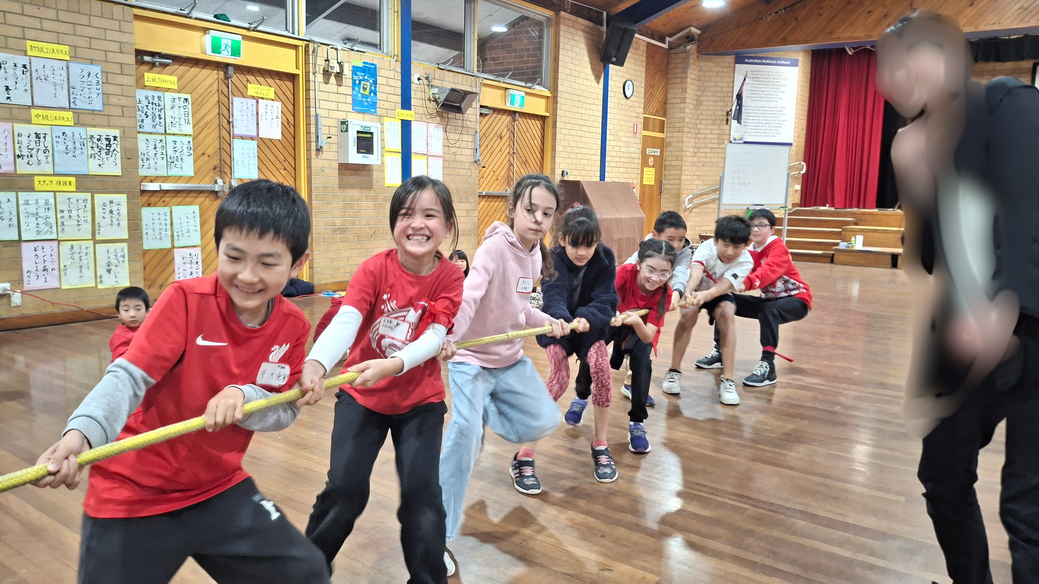 学校ホールでカルタ大会の後、三年振りにミニ運動会が行われました。 特進クラスの生徒をお手本に、キンディからみんなでラジオ体操をし、 その後は紅組、白組に別れて、様々な競技を楽しみました。 玉入れなどの日本の競技を初めて体験する生徒も多く、現地校とは違った運動会をとても楽しんでいました。