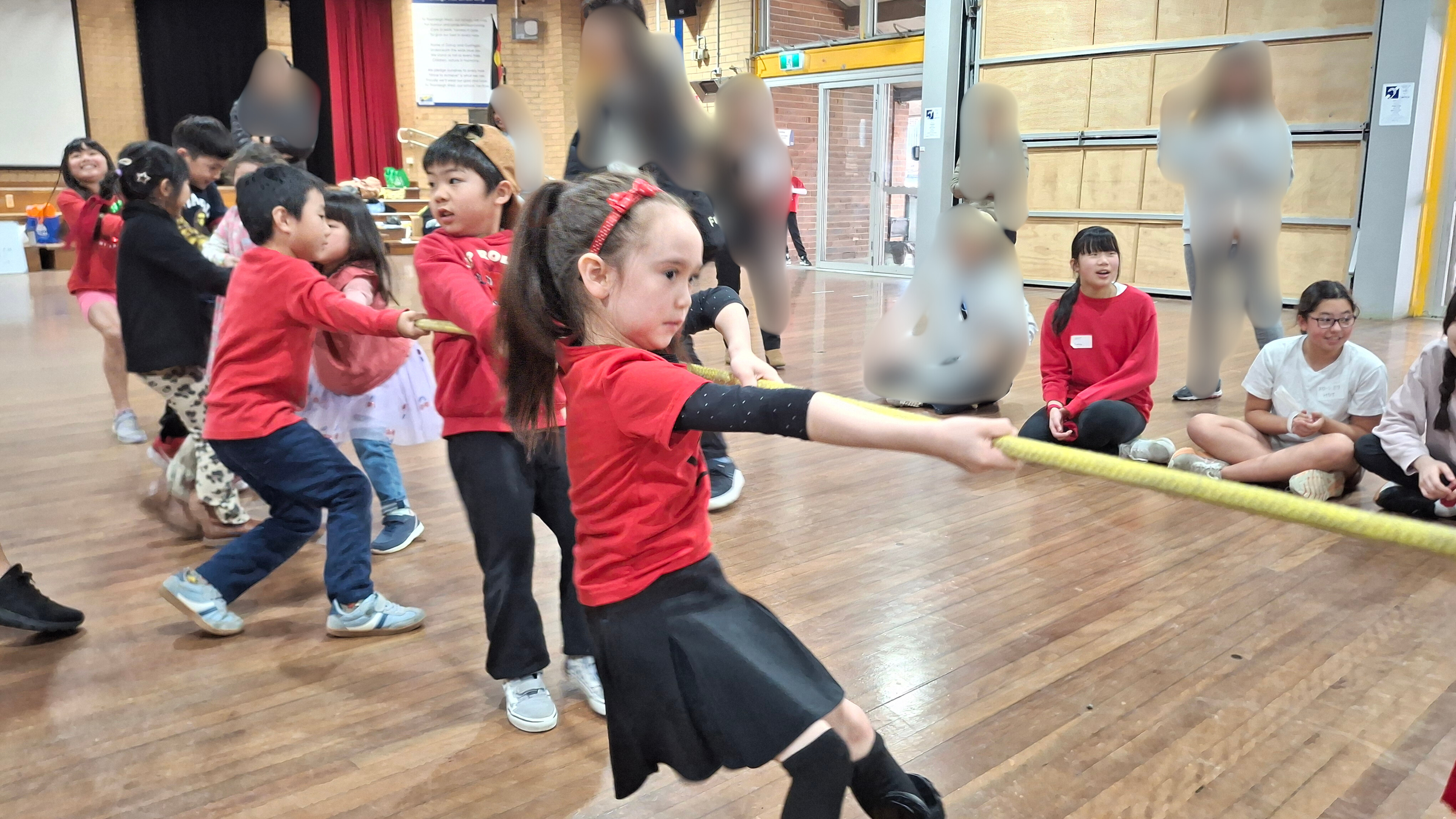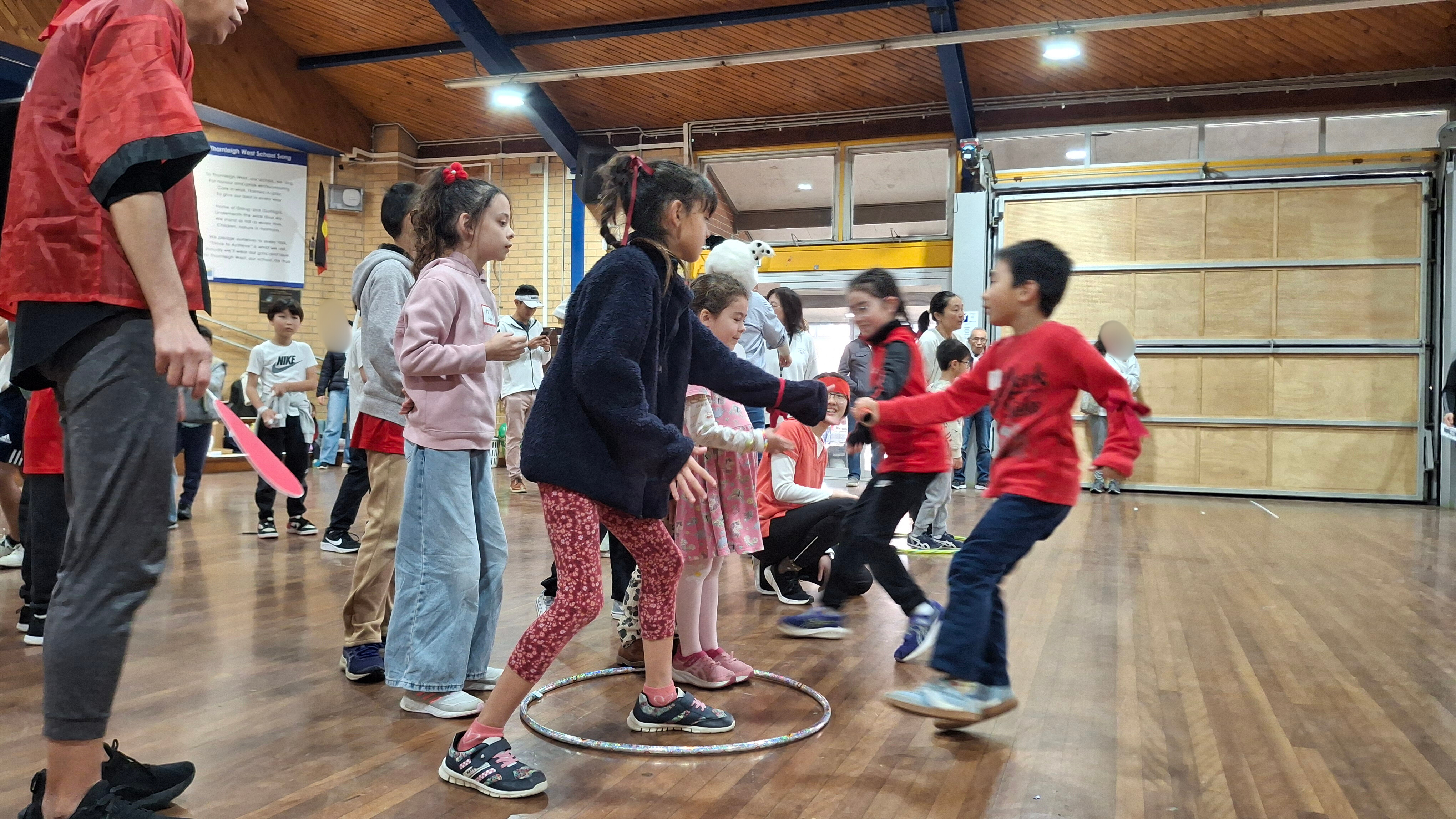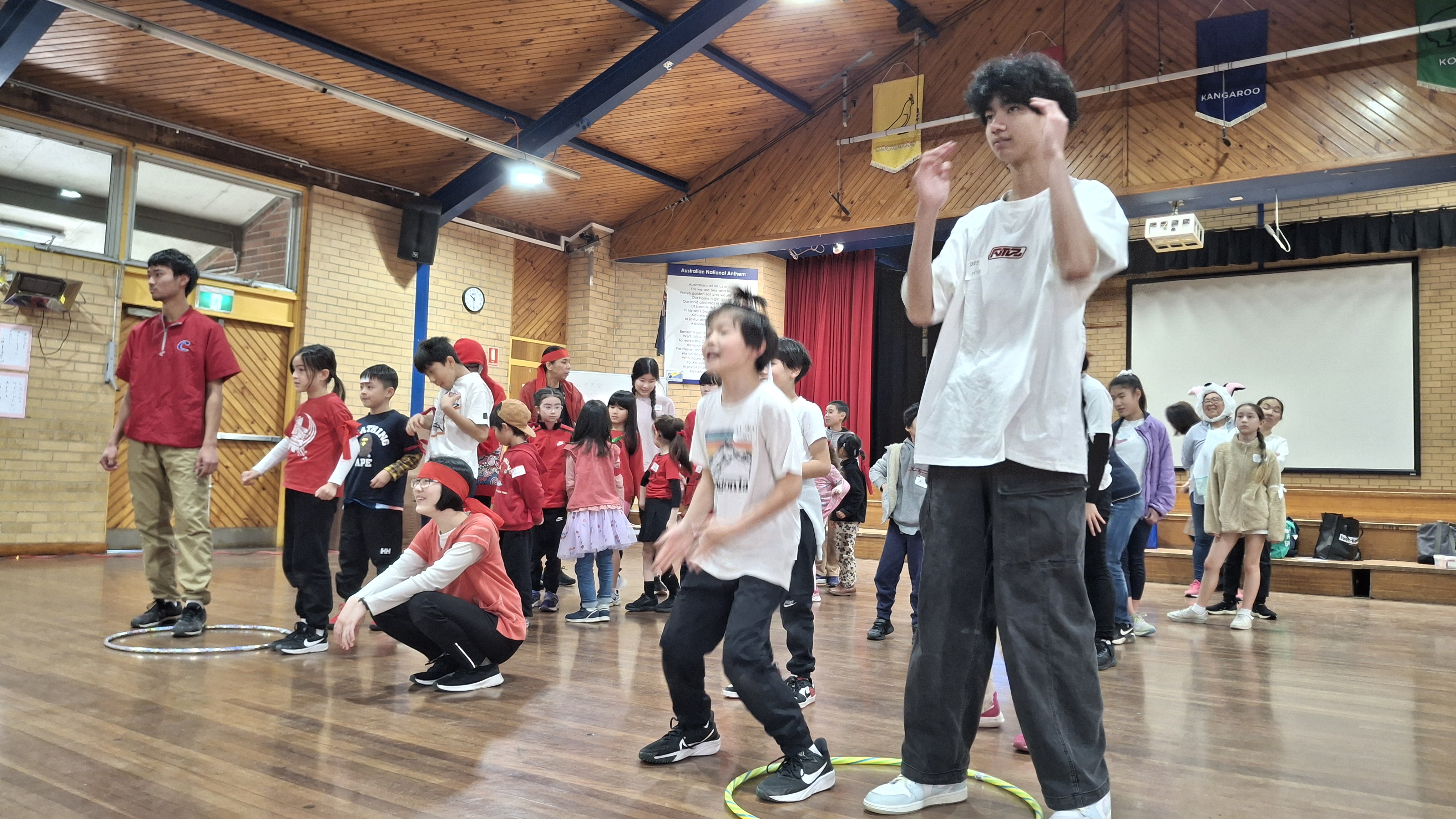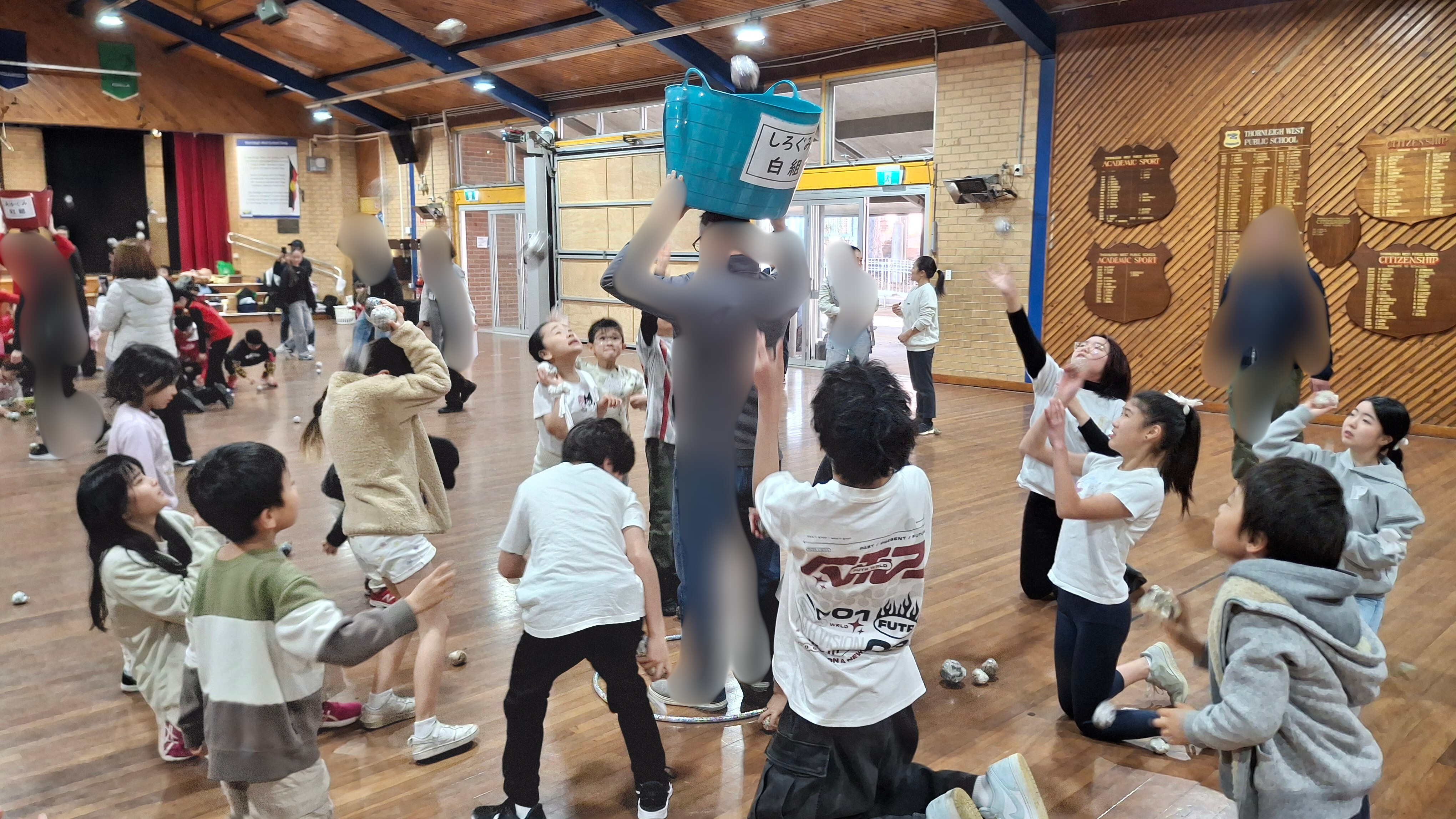 学校ホールでカルタ大会の後、三年振りにミニ運動会が行われました。 特進クラスの生徒をお手本に、キンディからみんなでラジオ体操をし、 その後は紅組、白組に別れて、様々な競技を楽しみました。 玉入れなどの日本の競技を初めて体験する生徒も多く、現地校とは違った運動会をとても楽しんでいました。